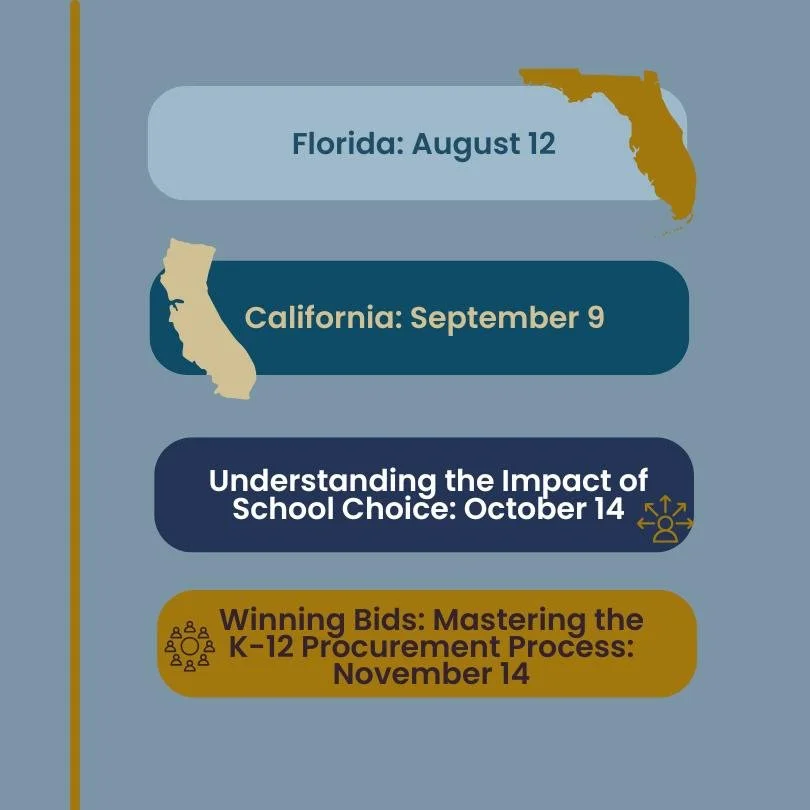 Join us for the remainder of our State Deep Dive Series. This is your opportunity to gain insights into the expansive markets of Florida and California. As we move into fall, we will explore the impact of School Choice and mastering the K-12 procurement process. Save your spot today!