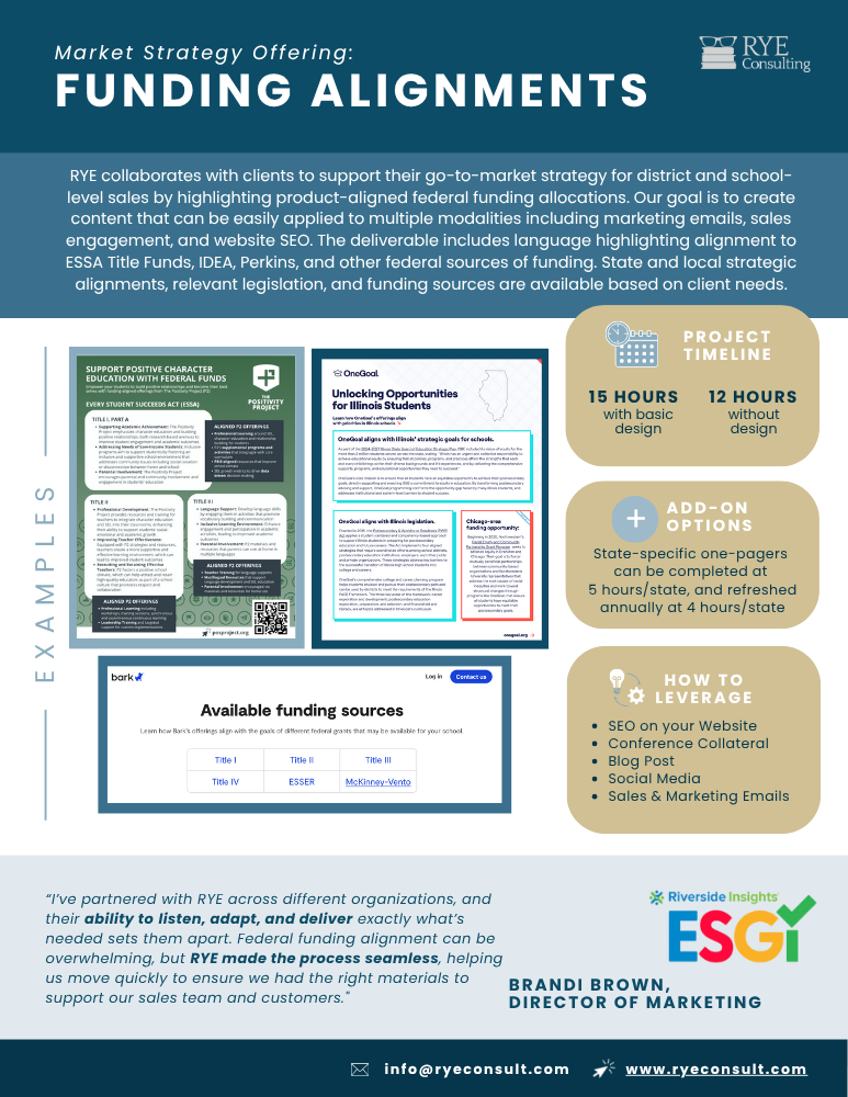 Our Funding Alignment documents remove the guesswork for Ed Leaders, clearly connecting your solution to available funding sources—making it easier for them to buy. We'll also develop strategic content that amplifies your message across every touchpoint: emails, sales conversations, and SEO-optimized web pages that attract qualified leads.