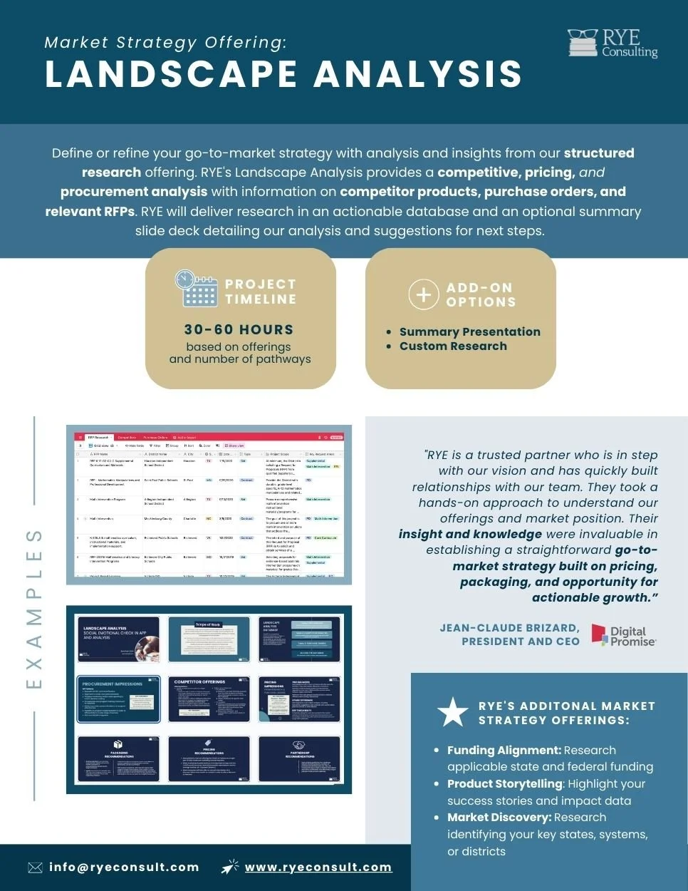 Get the competitive pricing and procurement analysis you've been waiting for with RYE's Landscape Analysis. With this offering, we will deliver research in an actionable database and an optional summary slide deck detailing our analysis and suggestions for next steps.