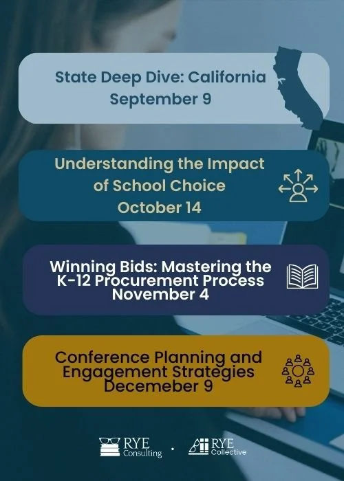 As the weather changes, so do the critical topics of discussion in the Edtech space. Join us for our final State Deep Dive California, and don't forget to register for our upcoming sessions, including Understanding the Impact of School Choice, Winning Bids: Mastering the K-12 Procurement Process, and Conference Planning and Engagement Strategies.